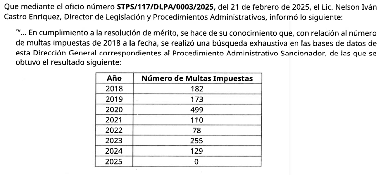 Para averiguar esto, poco antes de la extinción del INAI solicitamos información a la Secretaría del Trabajo y Previsión Social (STPS). En su respuesta (otorgada después de que tuvo que promoverse el recurso de revisión 279/25 ante la renuencia inicial para proporcionar los datos solicitados), dicha Secretaría manifestó que entre los año 2018 y 2024 apenas había impuesto 1,426 multas desglosadas de la siguiente manera: